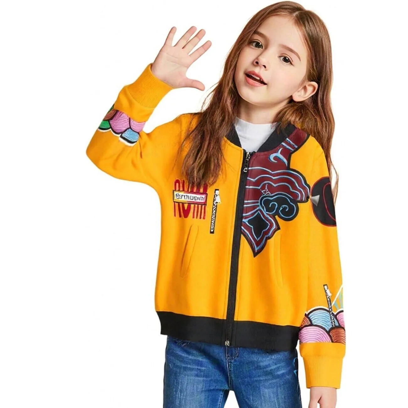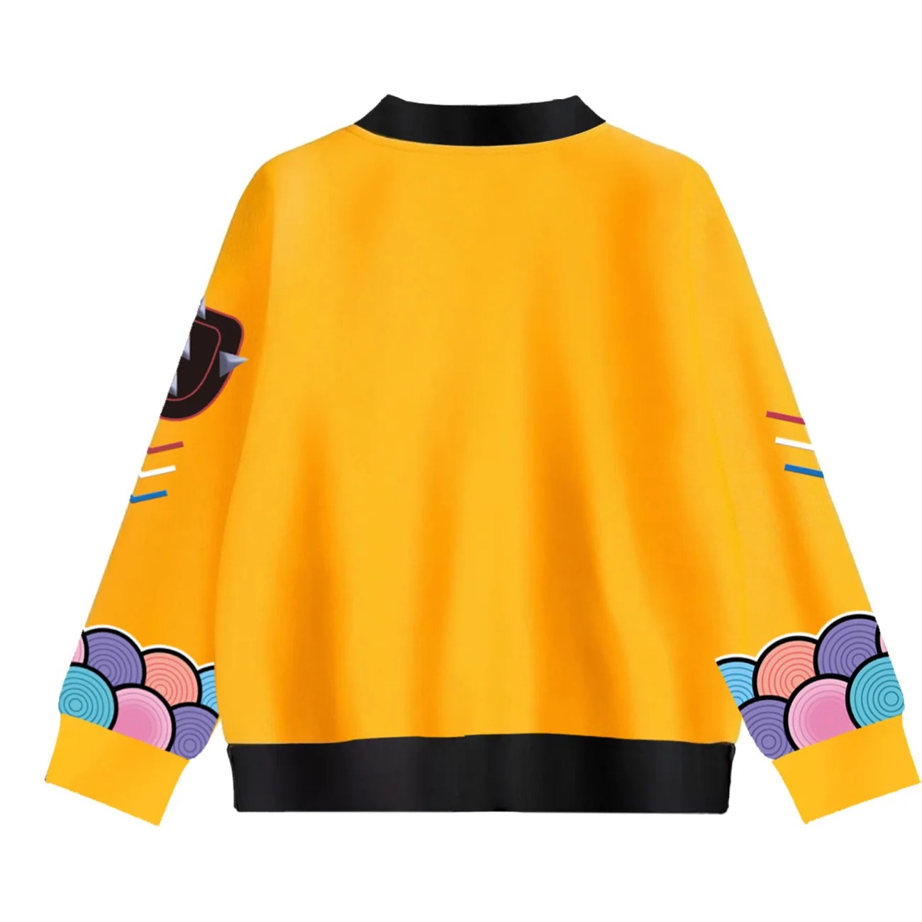 Veste pour enfant inspirée du film KPOP Demon Hunter, arborant le style unique du personnage Rumi. Un blouson jaune vif aux motifs colorés, idéal pour un look audacieux et fun. Disponible de 110 à 160 cm.